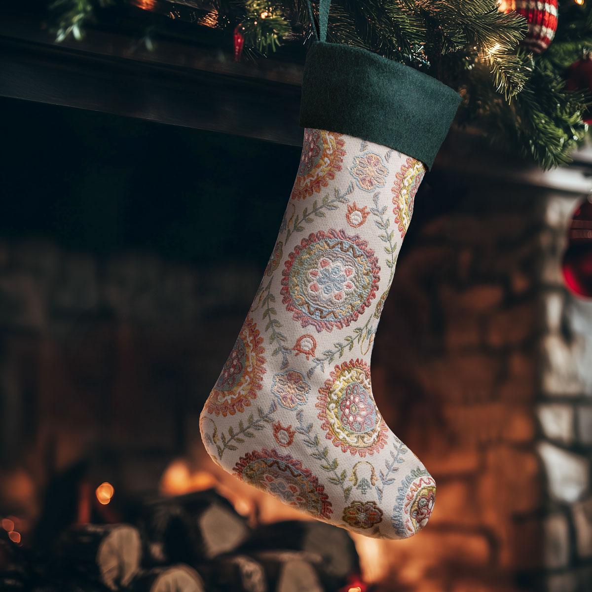 Διακοσμητική χριστουγεννιάτικη κάλτσα, ιδανική για να στολίσει το τζάκι, το δέντρο ή οποιοδήποτε γιορτινό σημείο του σπιτιού. Κατάλληλη για τοποθέτηση δώρων, γλυκών και μικρών εκπλήξεων, προσθέτοντας μια ζεστή και χαρούμενη πινελιά στη χριστουγεννιάτικη ατμόσφαιρα.